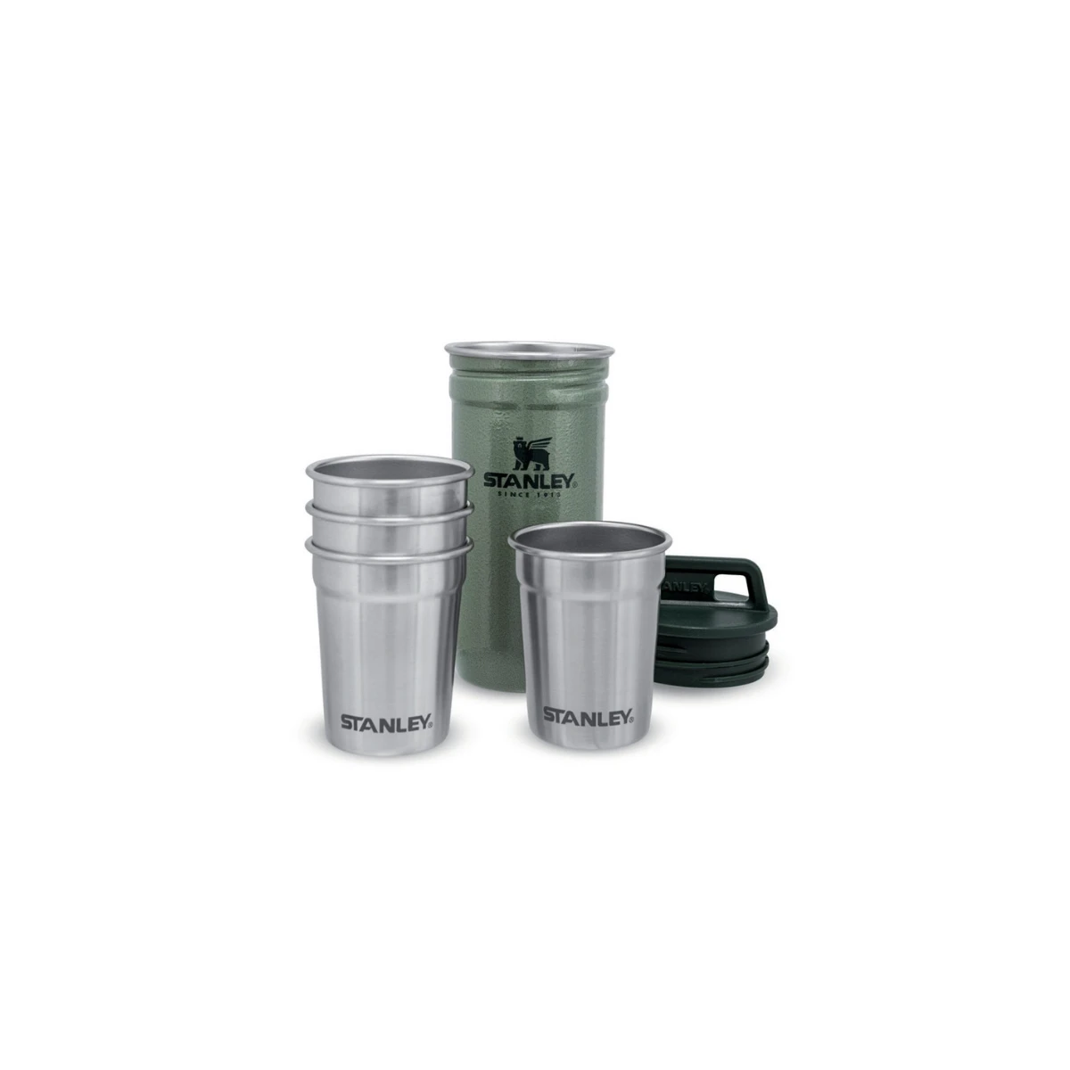 Lækkert shots glas sæt med 4 små glas i rustfrit stål. Leveres med en lille beholder med skruelåg med plads til alle 4 glas til opbevering. Sættet tåler maskinopvask.